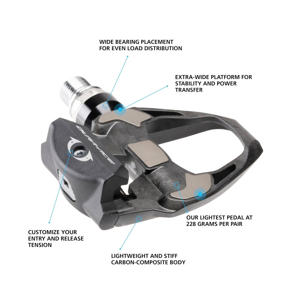 The Shimano Dura-Ace PD-R9100 Pedal Set is a high-performance racing pedal designed for road cycling. It features a lightweight carbon body that provides excellent power transfer and efficiency. The wide contact area and stainless-steel pedal axle ensure stability and durability.