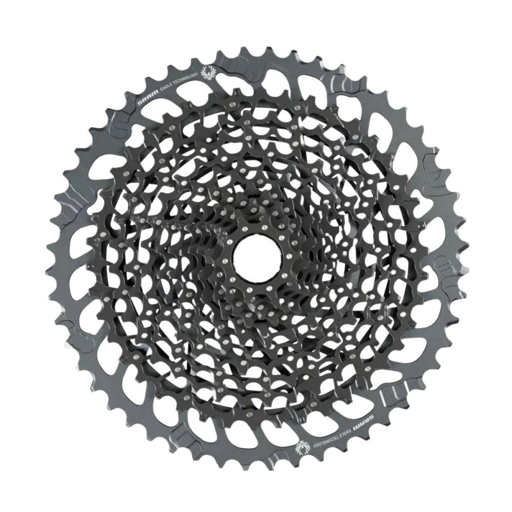 2. Cassette: The GX Eagle cassette is a 12-speed cassette with a wide gear range (10-52T) to tackle steep climbs and fast descents.