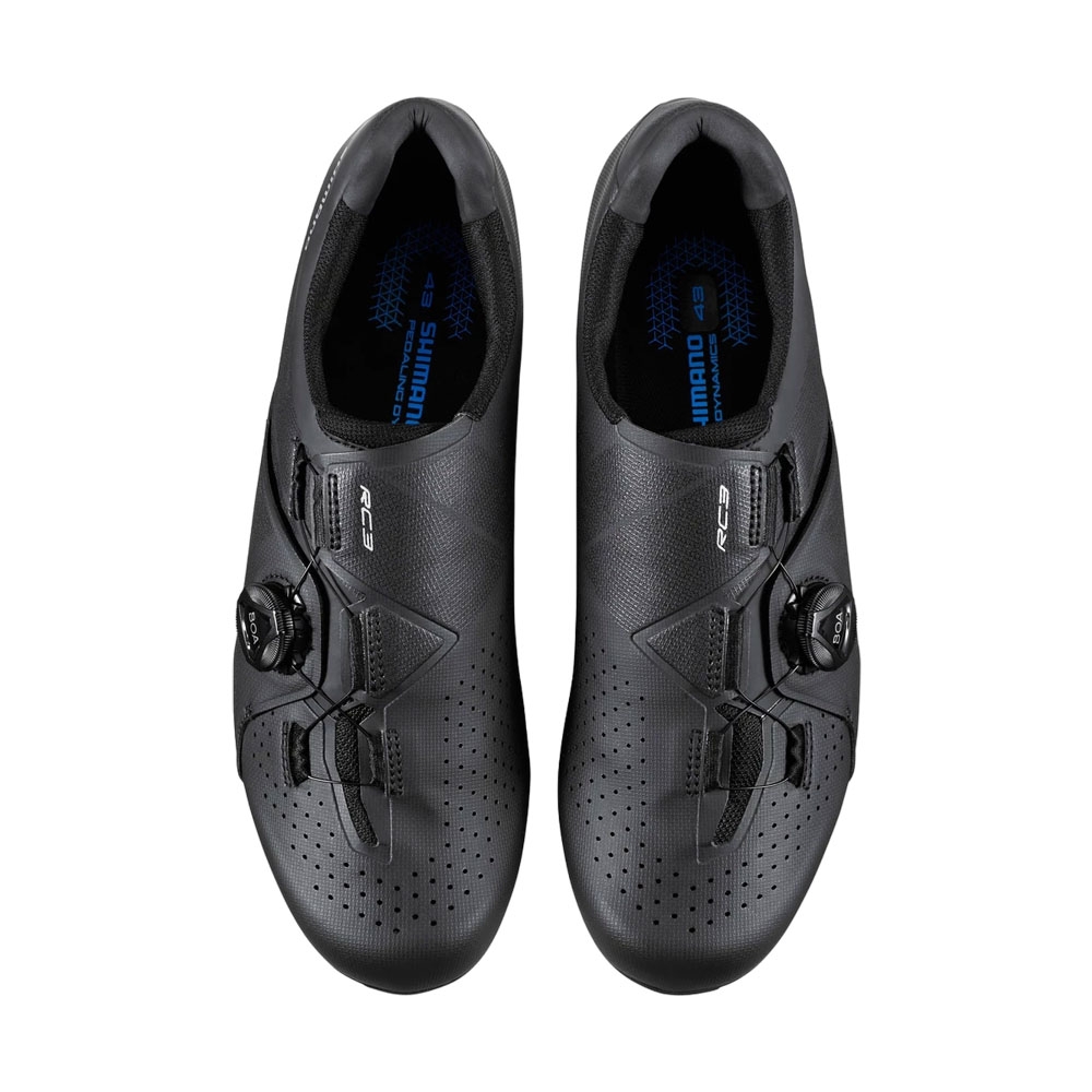 The Shimano RC3 Road Shoes are a high-performance cycling shoe designed for road biking. They feature a lightweight and breathable synthetic upper, with a secure and adjustable hook-and-loop closure for a snug fit. The RC3 Road Shoes also have a stiff carbon-reinforced sole for efficient power transfer, while the rubber outsole provides excellent grip and traction when walking off the bike. These shoes are compatible with three-bolt cleat systems, making them ideal for use with Shimano SPD-SL, Look, and other similar pedal systems. Overall, the Shimano RC3 Road Shoes are a great choice for road cyclists looking for a comfortable and high-performing shoes.